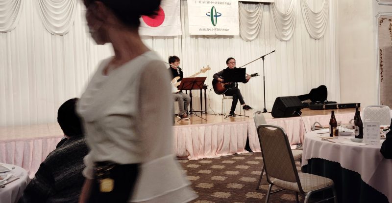 さらに、宇部出身の双子デュオ的場兄弟のライブを楽しんだ後、6年度入会の新会員の方々に壇上に上がっていただき、自社PRを行っていただきました。